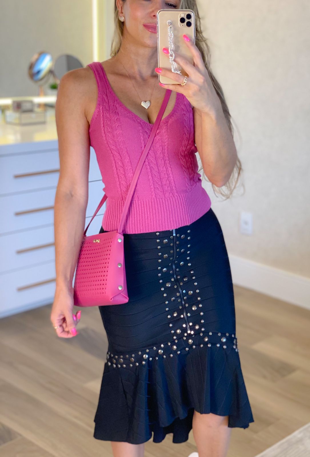Saia em bandagem com aplicações e ziper frontal