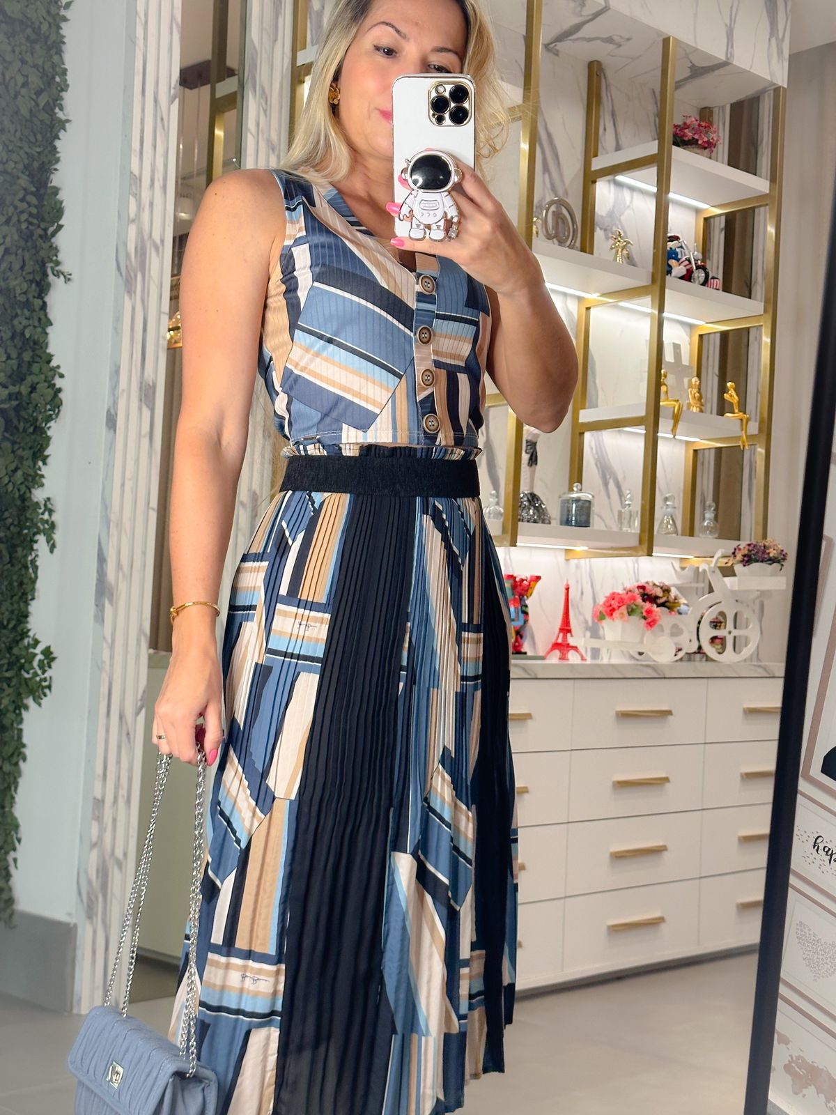 Saia mega estilosa plissada com estampa etnica em tons de azul e preto